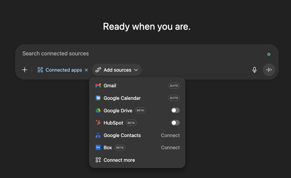 נכנסים לתפריט Settings > Connectors ואז בוחרים ב-Gmail ו Calendar, מאשרים את החיבור, ואז פשוט בוחרים בConnected apps ומפעילים אותן.