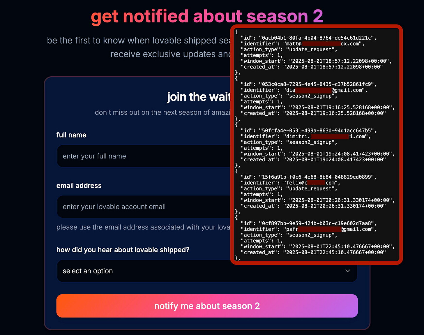 בתמונה - מידע שעובדי Lovable חשפו באפליקציה שהם פיתחו ותומר מצא באמצעות SafeVibes (כן, האירוניה חוגגת)