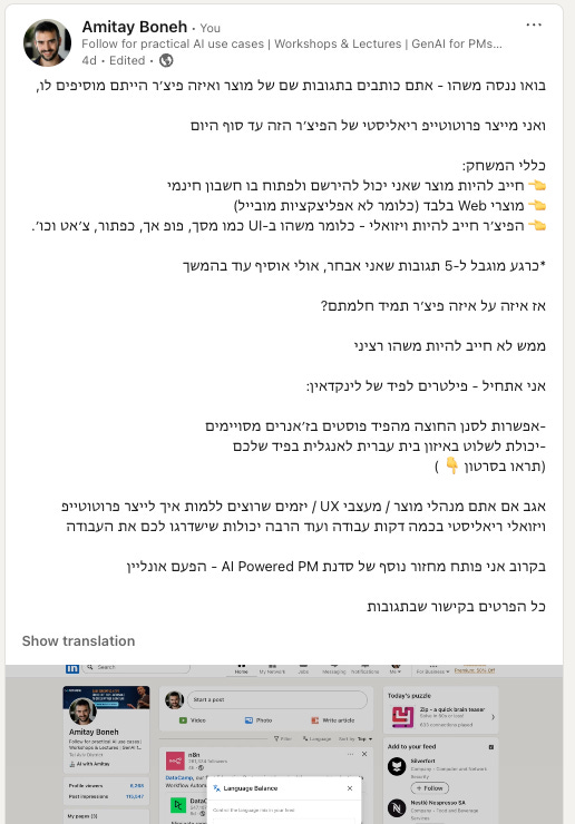 כדי לאתגר את עצמי -השבוע שיתפתי בלינקדאין אתגר בו ביקשתי מהקוראים להציע רעיונות לפיצ׳רים למוצרים ואני הייתי צריך לבנות להם פרוטוטייפ ויזואלי עוד באותו היום.