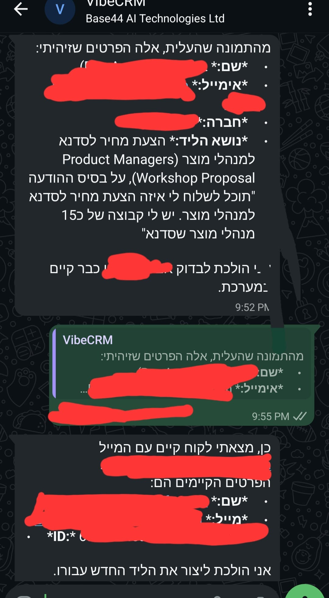 במובייל - הוספתי לאייג׳נט שיוצר לי לידים בשפה חופשית דרך הודעת ווטסאפ, פיצ׳ר זיהוי תמונה שמאפשר לי לשלוח לו צילום מסך של ההתכתבות, והוא מחלץ משם את כל הפרטים ויוצרת ליד איש קשר וליד חדש (בינתיים עובד מדהים!)