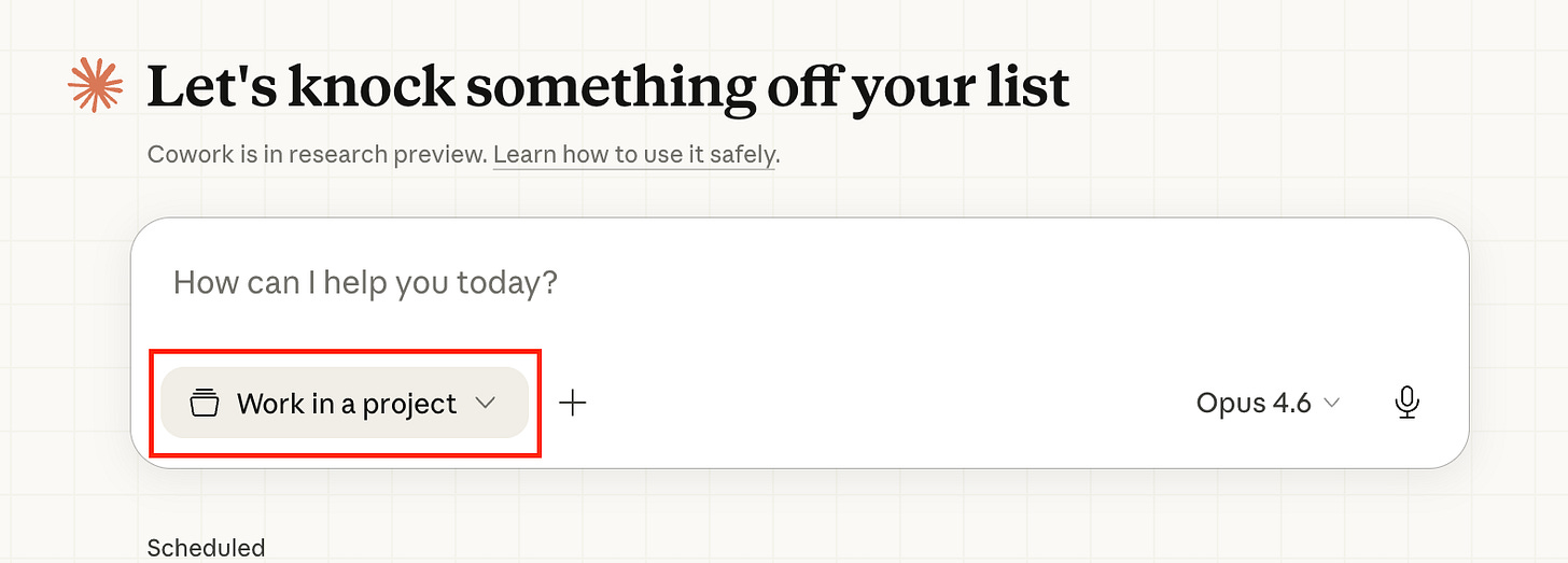 פותחים את האפליקציה ומחפשים את הטאב Cowork בצד. לוחצים עליו, ואז לוחצים על “Work in a Folder” בתחתית המסך ובוחרים את התיקייה שיצרתם.