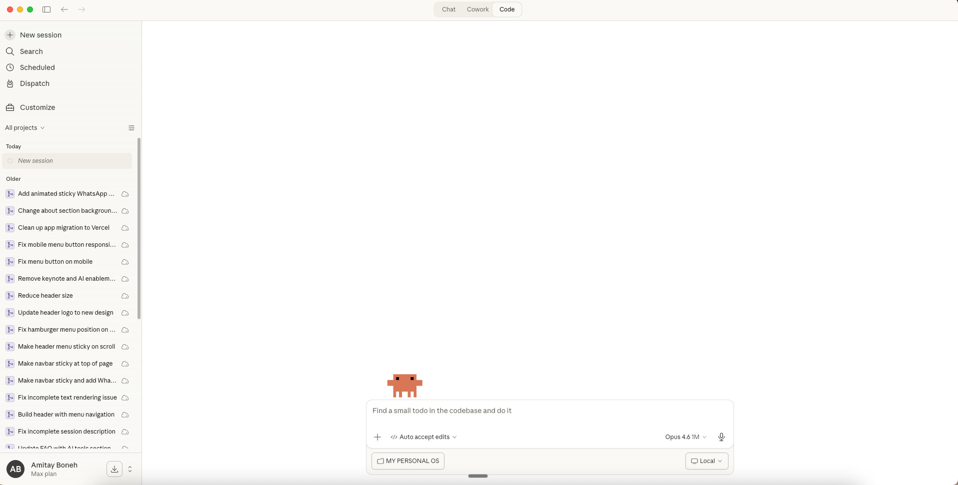 יש כמה הבדלים שאגע בהם בהמשך, אבל השוני המרכזי הוא שבמקום שיחה חד פעמית שמתחילה מאפס כל פעם, ב-Cowork אנחנו עובדים בתוך תיקייה מקומית במחשב שלנו.