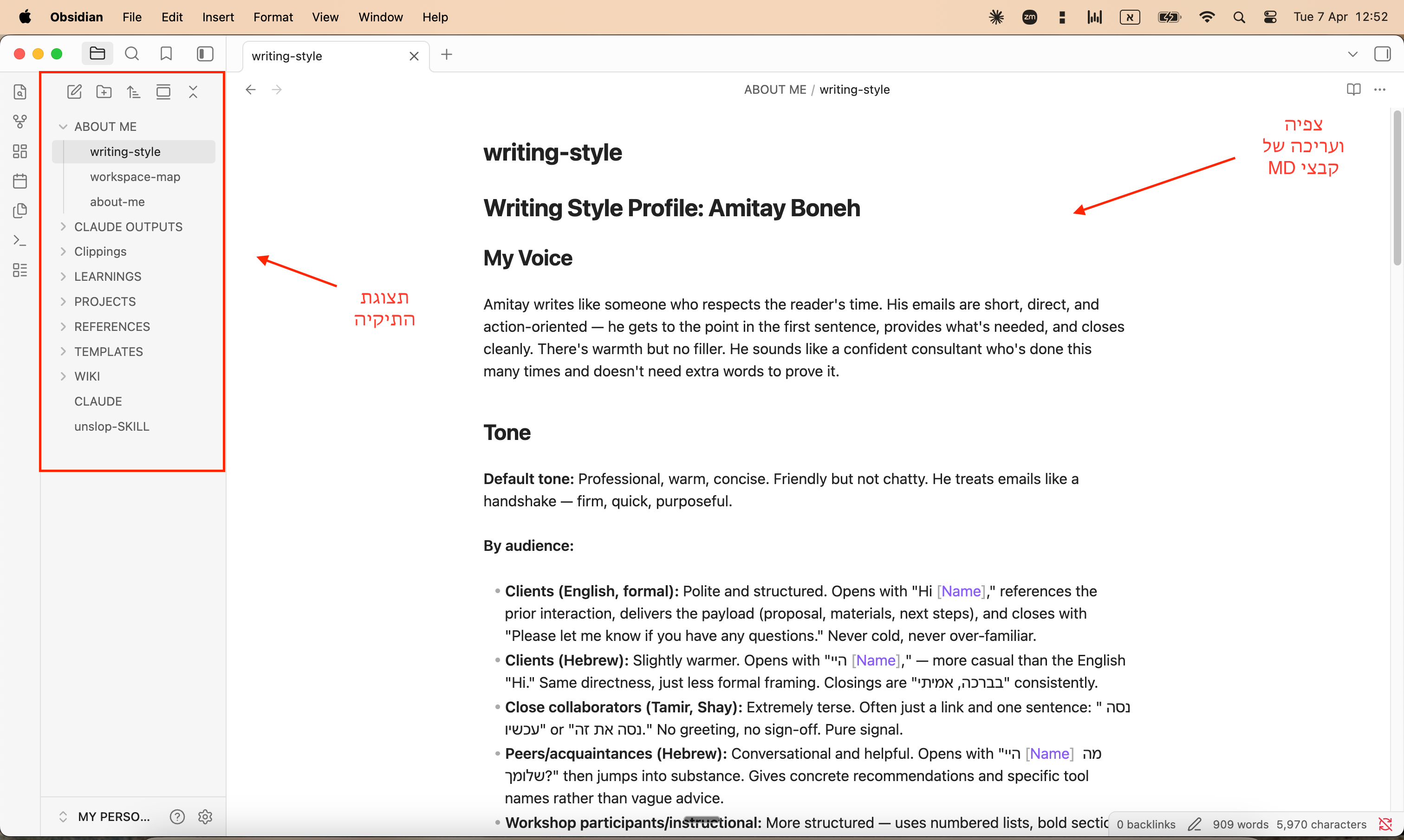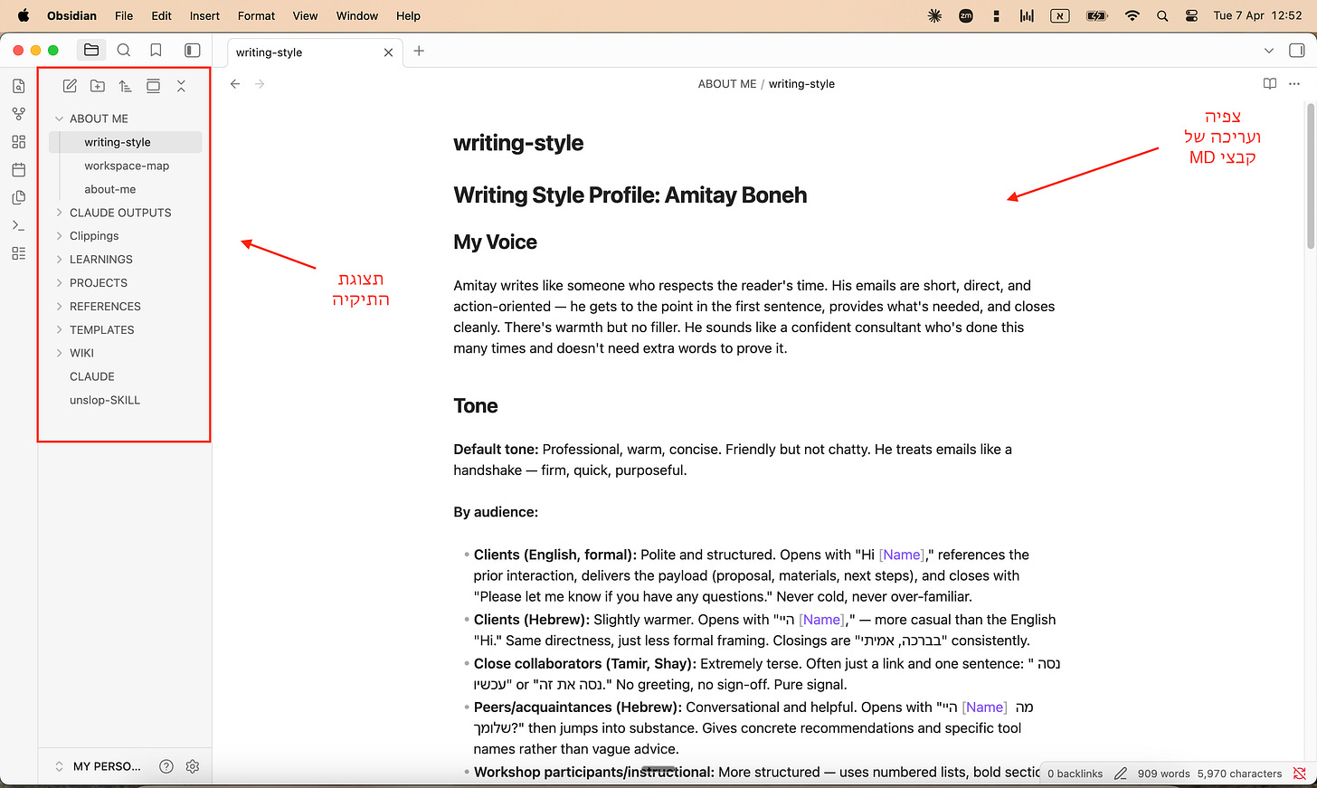 טיפ: כדי לצפות ולערוך קבצי Markdown בצורה נוחה, אני ממליץ להשתמש בתוכנת open source בשם -Obsidian (להורדה חינם ב-obsidian.md).