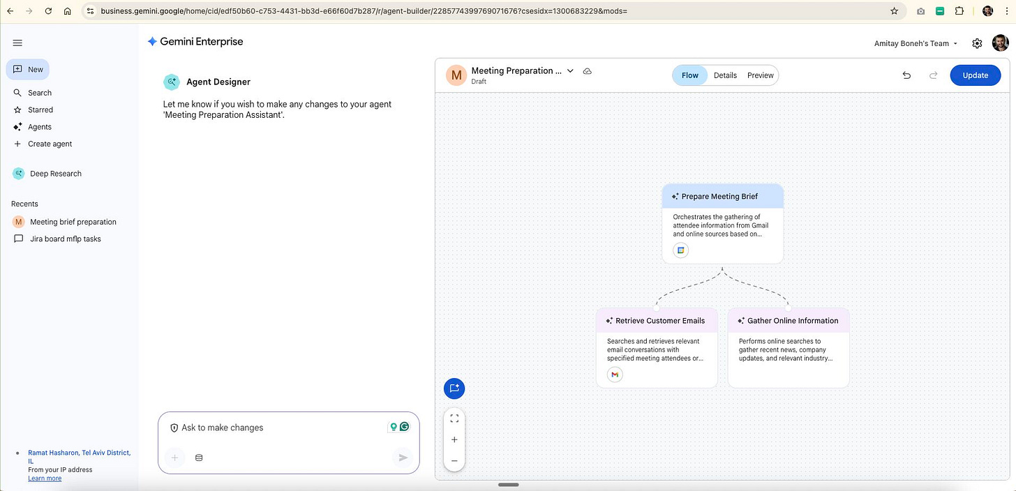 בתמונה תוכלו לראות את האייג׳נט הראשון שבניתי (בפרומפט אחד) - אייג׳נט הכנה לפגישות עם גישה ליומן, לGmail ולאינטרנט שיודע לחפש מידע על המשתתפים בהיסטוריית המיילים ובאינטרנט ולהכין אותי לפגישות.