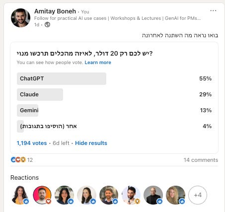 הסקר עדיין רץ, אבל יש כמעט 1200 הצבעות שזה מדגם לא רע. כפי שאפשר לראות ChatGPT עדיין מוביל, אבל הפער לטובת קלוד וג’מיני מצטמצם (בסקר הקודם שערכתי לפני חצי שנה הוא קיבל מעל 70%). יהיה מעניין לראות איך ייראו תוצאות הסקר בעוד שנה מהיום, לי כבר יש ניחוש…