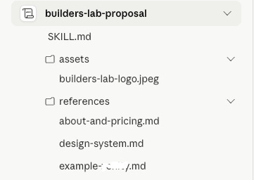 התיקיה מורכבת מקובץ הSKILL.MD, מהלוגו שלשנו וקבצי Reference כמו דיזיין סיסטם, מחירים והצעה לדוגמה. כך זה נראה: