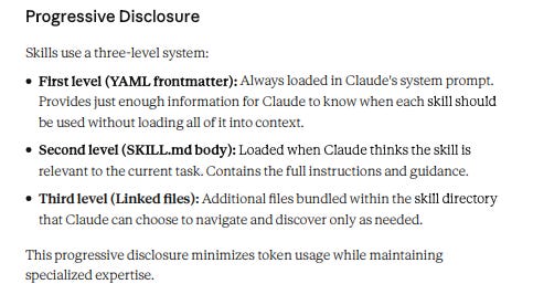 ב-Skills זה עובד אחרת, בזכות מנגנון שנקרא Progressive Disclosure.