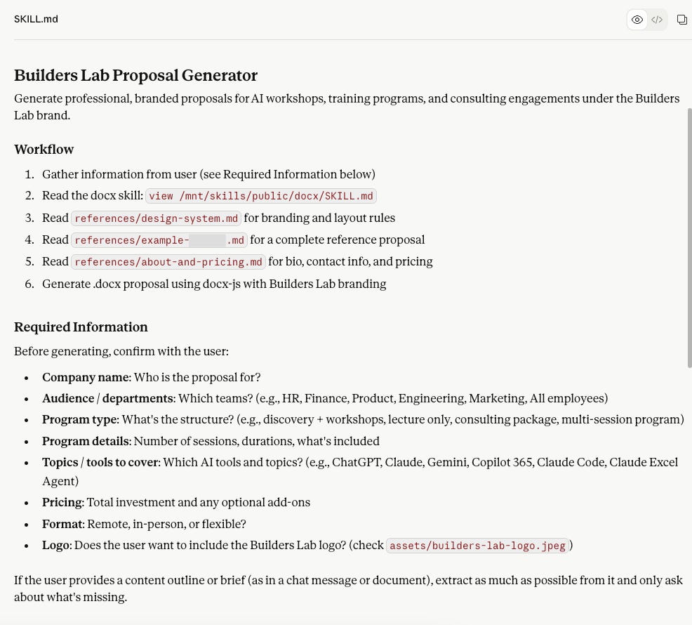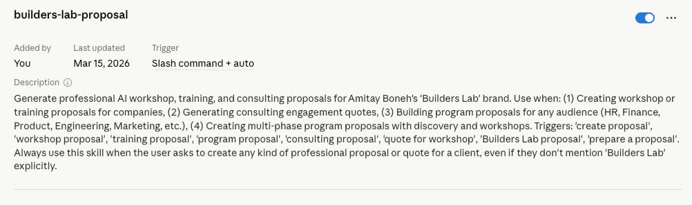 בשביל שזה לא יישאר תיאורטי, הנה דוגמה ל-Skill אמיתי שאני משתמש בו: מחולל הצעות מחיר של Builders Lab.