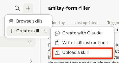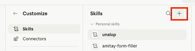 כדי לטעון ב-Cowork לוחצים על Customize > Skills ואז על סימן ה + ובוחרים באפשרות Upload a skill.