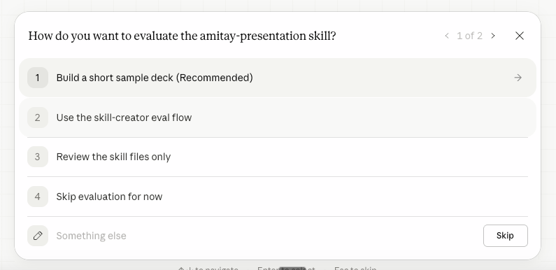 עוד שיטה יותר מתקדמת - היא האבלואציה שקלוד מריץ בעצמו במהלך יצירת ה-Skill עם ידי הרצאה של כמה תרחישים. הוא יציע לכם לבד לעשות את זה וישאל האם לעשות אבלואציה מהירה או מלאה.