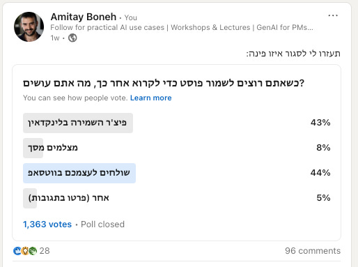 בסקר ששיתפתי השבוע בלינקדאין גיליתי שכ45% מהאנשים שולחים לעצמם בווטסאפ פוסטים כדי לחזור אליהם אחר כך.